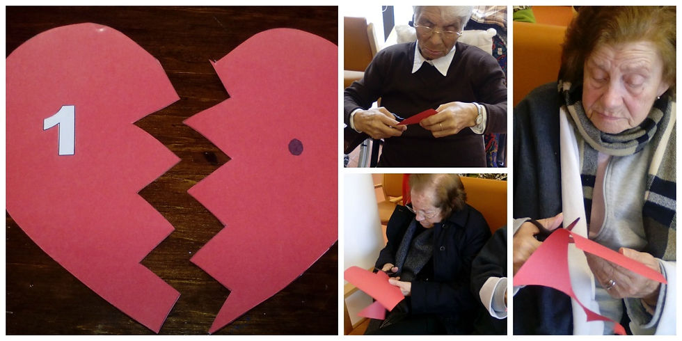 Quando já estiverem todos os corações recortados pelos nossos idosos, iremos ter três fases: 1º desenhar os números e as bolinhas consoante o número colocado no coração, 2º fazer o meio do coração e recortar em forma de ziz zag e 3º plastificar.